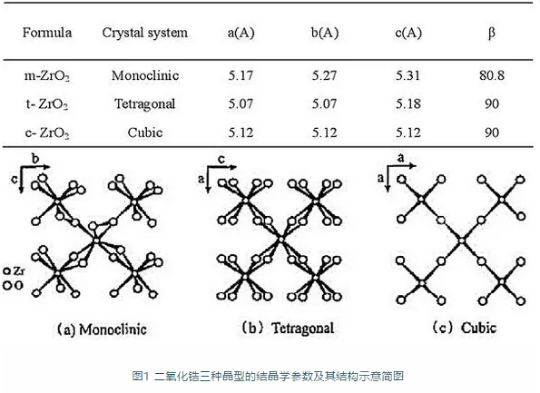 常溫下純二氧化鋯是絕緣體,加入穩(wěn)定劑可使其導(dǎo)電率升高且在高溫下能呈現(xiàn)出離子型導(dǎo)電。二氧化鋯有三種晶型,結(jié)晶學(xué)參數(shù)及其三種晶型的結(jié)構(gòu)示意簡(jiǎn)圖如下所示。