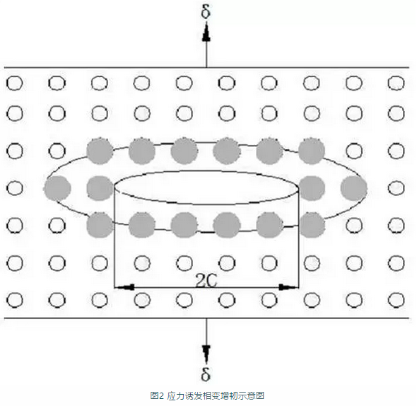 但從另一角度來(lái)看,人們利用穩(wěn)定劑及某些特定工藝控制氧化鋯的馬氏體相變,在室溫下可獲得對(duì)外界應(yīng)力敏感的亞穩(wěn)態(tài)四方相氧化鋯,制造出可相變的高韌性氧化鋯陶瓷材料,如下圖所示,為應(yīng)力誘發(fā)相變?cè)鲰g的示意圖。