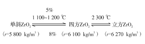 二氧化鋯還具有馬氏體相變的特性, 這是二氧化鋯被用來提高陶瓷材料的韌性和耐火材料熱震穩定性的重要依據。單斜二氧化鋯不能直接用來制造制品,在溫度發生變化時會產生相結構的轉變: