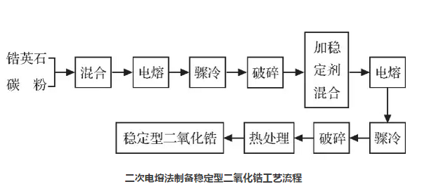 二次電熔法是將鋯英石與碳粉按比例混勻后,經電弧爐電熔脫硅處理,驟冷,再經破碎制成單斜二氧化鋯。再將單斜二氧化鋯根據需要按比例配入某種穩定劑,混合均勻后進行第 2次電熔,電熔好后驟冷,再經破碎、熱處理后便可制成穩定的二氧化鋯。此方法制得的穩定二氧化鋯雜質含量低,致密度高。工藝路線如圖。