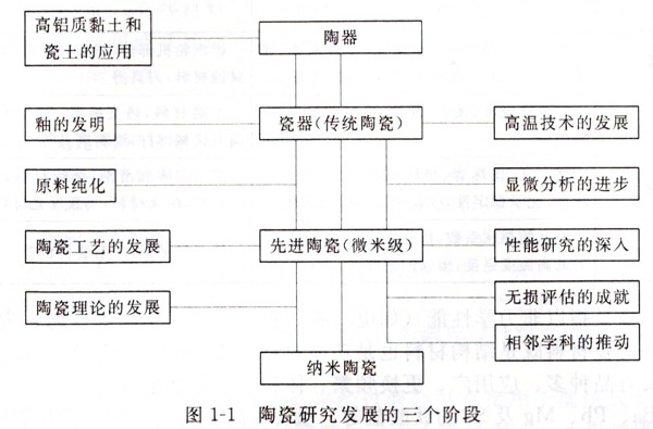 總的來(lái)說(shuō),陶瓷是一種既古老而又年輕的_:程材料,陶瓷材料的發(fā)展經(jīng)歷了從陶瓷發(fā)曩裂瓷器.從傳統(tǒng)陶瓷發(fā)展到先進(jìn)陶瓷,從先進(jìn)陶瓷發(fā)展到納米陶瓷三次重大飛躍(見(jiàn)圖I-I),而這三次飛躍只是中華文明史的一個(gè)縮影。