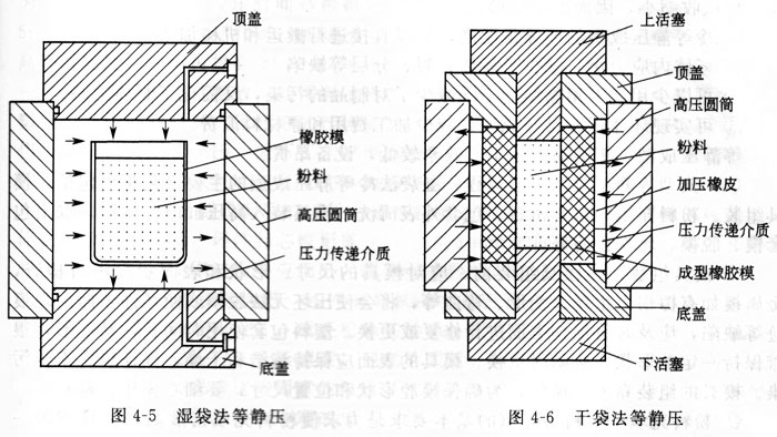 冷等靜壓又分為濕袋法和干袋法兩種等靜壓。濕袋法等靜壓是將粉料先放入成型模具(即包套)內(nèi),經(jīng)密封后再置于高壓缸中進(jìn)行壓制。在壓制過(guò)程中,包套完全浸入液體,與壓力傳遞介質(zhì)直接接觸。濕袋法等靜壓適用性強(qiáng),尤其適合用于實(shí)驗(yàn)研究和小批量生產(chǎn),并可同時(shí)在一個(gè)高壓缸內(nèi)壓制兩種以上不同形狀的制件及生產(chǎn)大型和形狀復(fù)雜的制件,生產(chǎn)流程短且成本低廉。濕袋法等靜壓的模具及坯料的放置方式如圖4-5所示。