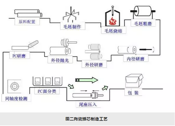 陶瓷插芯制作工藝分兩部分,即毛坯制作和精密機械加工,首先用經過特殊處理的采用釔穩定的納米氧化鋯粉體原料,造粒后在專用的模具中注射成型,然后經高溫燒結成毛坯,第二部分則是將毛坯經一系列精密研磨加工,達到亞微米級的加工精度,從而得到剛性好,精度高的陶瓷插芯產品。