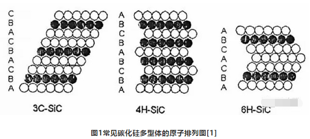 碳化硅以共價(jià)鍵為主,共價(jià)鍵約占88%。晶格的基本結(jié)構(gòu)是互相穿插的SiC4和CSi4四面體。由于四面體堆積次序的不同形成不同的結(jié)構(gòu),至今已發(fā)現(xiàn)幾百種變體,常見的結(jié)構(gòu)如3C-SiC、4H-SiC、6H-SiC等,堆積規(guī)律如圖所示。