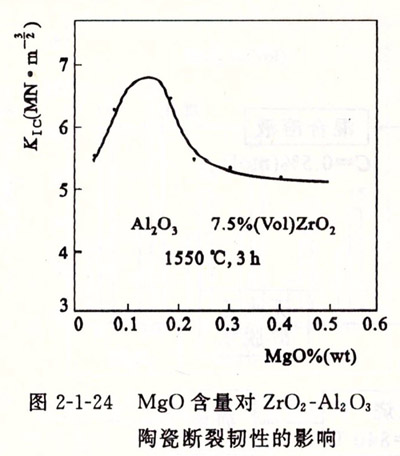 為了進一步改善增韌效果,適當引入其他物質,形成固溶體,例如引入Mg0、Al。()。、【:c()及Hfoz等。當氧化鋯中含有0.12%(mol) Mg0時,ZTA陶瓷的斷裂韌性(KIc)有最大值。如圖2-1-24所示。引入Alz Oa,可以抑制氧化鋯晶粒長大。又如引入Hfoz,由于Hf07具有和氧化鋯類似的結構和特性,而且由于它比氧化鋯具有更高的M,(相轉變溫度)和A,(逆相變終止溫度),同時還具有比氧化鋯低的熱膨脹系數和相變 t-氧化鋯一m-氧化鋯體積效應。因此Hf02有較高的耐高溫性能和抗熱震性。另一方面,由于Hf02高的姚溫度, t-氧化鋯向m-氧化鋯的相變驅動力大,相變的臨界顆粒尺寸也小,所以在冷卻過程中,很難保存足夠的t-氧化鋯,這對相變增韌是有利的。但當Hf02-氧化鋯固溶體中引入少量Y2 0a和采用特殊工藝手段,可以使Y2 0a -Hf02 -氧化鋯固溶體獲得較高的t-氧化鋯,具有良好的增韌增強效果,同時可以改善ZTA陶瓷的高溫性能。